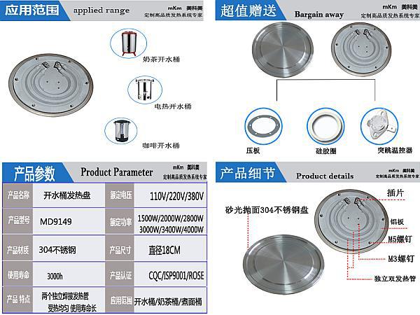 为了适应市场的需求,中山美科美电热管厂历经三个月,开发研制了一款新型开水桶发热盘,它是一款保温、加热两功能的开水桶发热配件,采用304不锈钢材料制造,防锈、抗变型、耐磨等性能比采用一般不锈钢材料的产品更强、更好、更能保证饮用健康和安全。外形高档且美观大方,并自带三重保护(开水沸腾保护、干烧保护和异常熔断保护),确保使用方便,安全。
