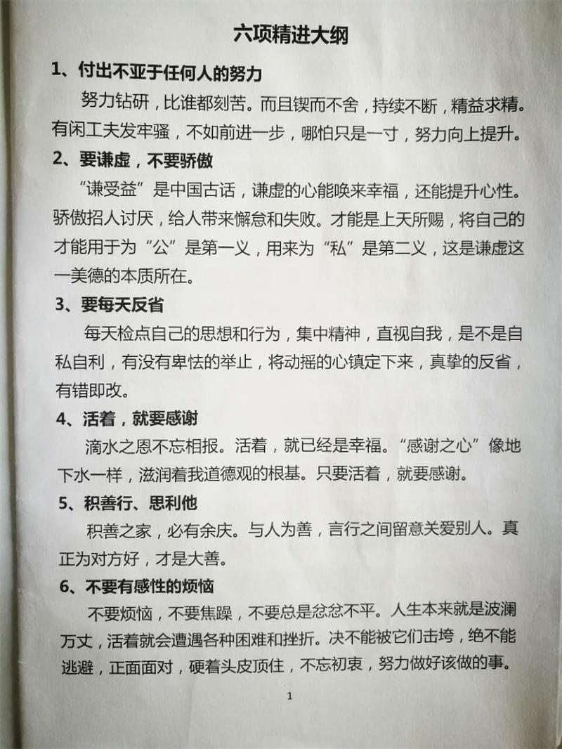 在工作中,我们每个人都在(付出不亚于任何人的努力), 在生活中,我们都应该做到(活着,就要感谢),不管面对着怎么样的状态我们应该(不要有感性的烦恼)...。看似简单的短短几条六项精进,却让我们受益终生。