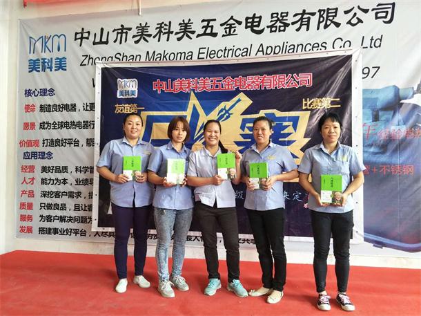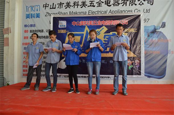 10月23日中山美科美消毒器发热管厂举行诵读稻盛和夫的六项中的活着就要感谢,部门与部门之间进行PK,流畅、有感情、无错误的组别进行评分和评出一、二、三名。